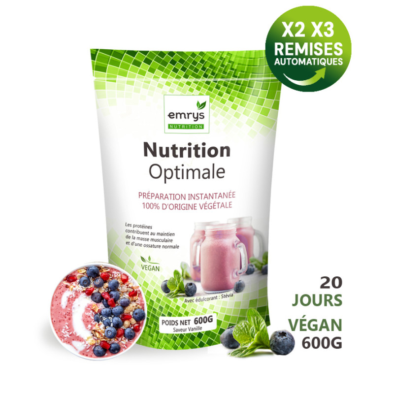 Nutrition Optimale est une formulation vegan, riche en protéines, fibres, oméga 3, MCT, prébiotiques et céréales germées sans gluten pour réaliser de délicieux shakes nutritifs et sains pour mincir, récupérer après l'effort, se créer un petit déjeuner équilibré...