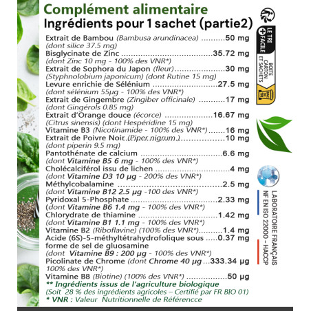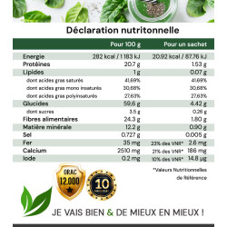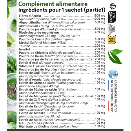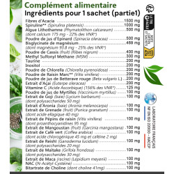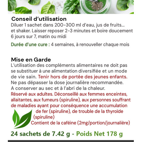 Déconseillé aux personnes souffrant de maladies ayant pour conséquence une accumulation de fer (spiruline). (Apport de 2.6mg / sachet soit 23% des VNR)