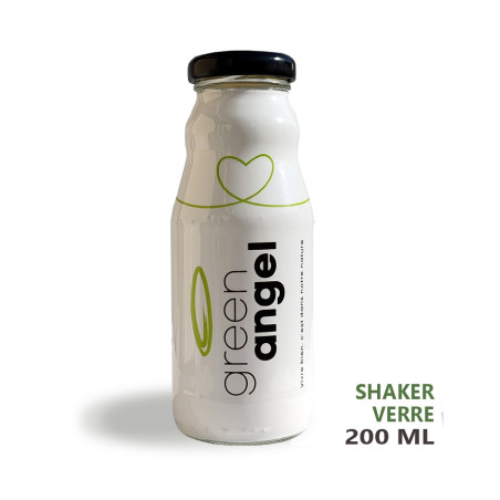 Un shaker en verre de 200 ml, gradué pour ajuster vos apports de liquide (eau et jus de fruits) avec votre poudre Green Angel.